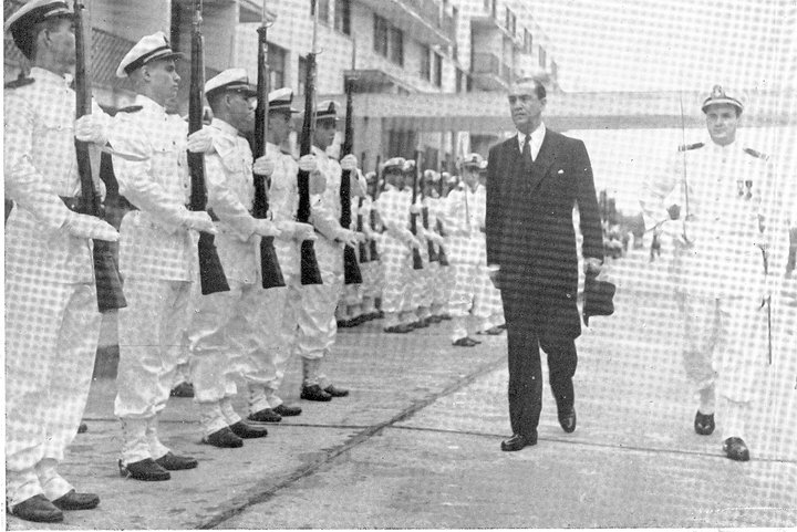Cerca de 0900 horas, o Chefe da Nação dava entrada na Escola, onde prestou honras um destacamento do Grupo de Fuzileiros Navais, alunos da Escola de Marinha Mercante e um contingente de Oficiais do navio-escola belga “Mercator”.